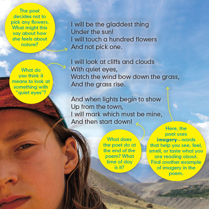 You Try It: Millay writes about spending time in a place she loves. Many of her sentences begin with “I will.” Write your own “I will” poem about a place you love. What will you do there? What will you see and enjoy?