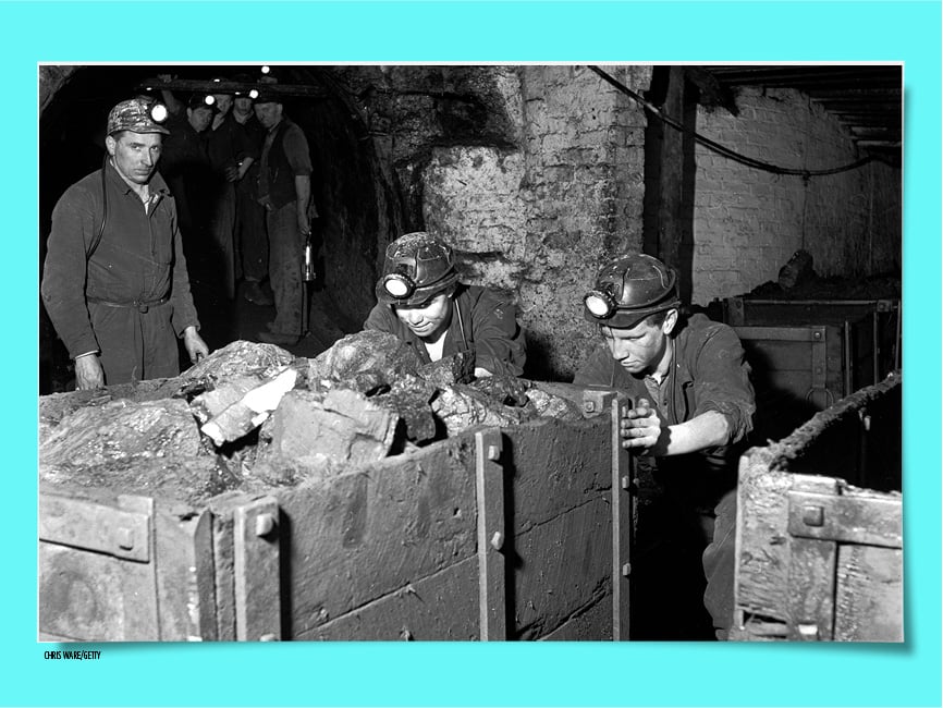 Mining coal was tough and dirty work. Miners blasted through rock. They cut out the coal with heavy tools. They shoveled the coal into little metal cars. Then they used mules to pull the coal cars along metal tracks.
