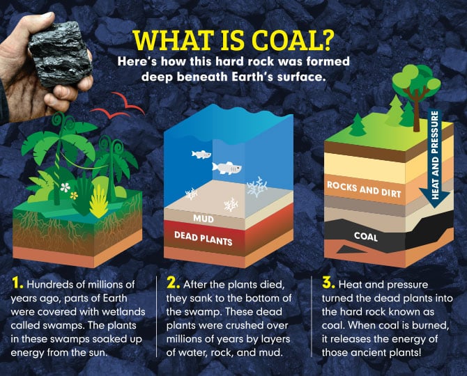 Coal is a rock-like substance from the ground. It’s a fossil fuel, like oil and gas. When you burn coal, heat and energy are released.