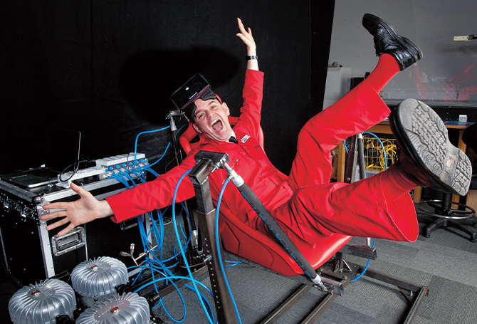 Here’s Brendan with a special machine in his lab. It takes people on a virtual reality thrill ride!