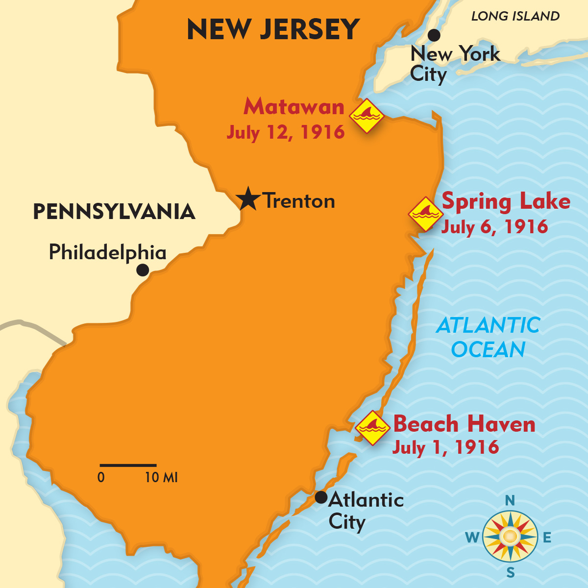 In July 1916, there was a series of shark attacks along the New Jersey coast. Three men and one boy died.